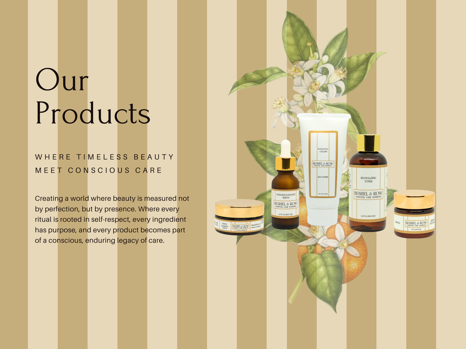 Bushel & Row exists to redefine modern beauty — thoughtful, pure, and enduring. We create skincare that feels as honest as it is effective, rooted in nature and refined through intention. Every formula is a reflection of quiet luxury and conscious care — made to nurture both the skin and the soul.